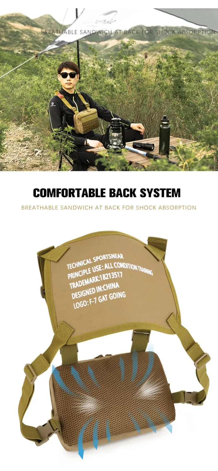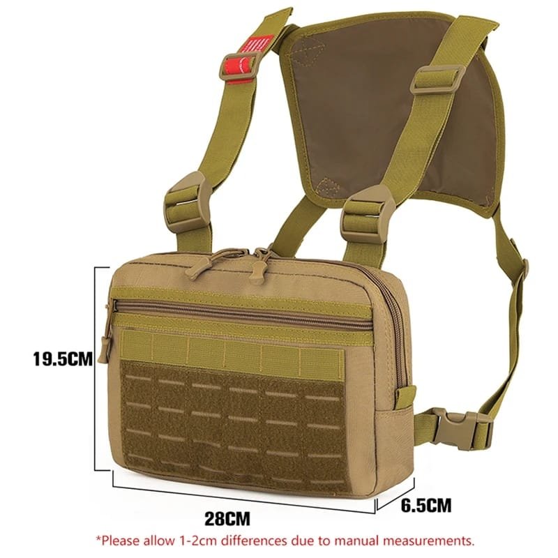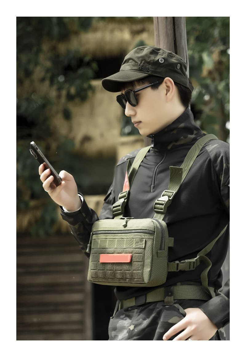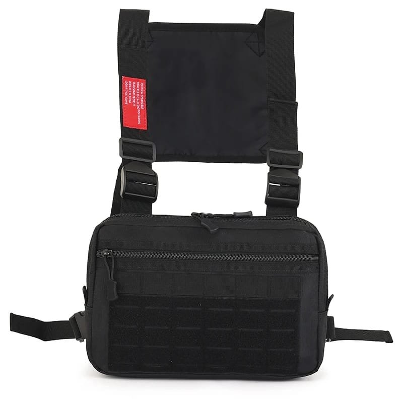 - La bolsa de pecho está diseñada con material de tela resistente al desgaste, específicamente tela Oxford, lo que la hace impermeable y resistente a las condiciones climáticas.